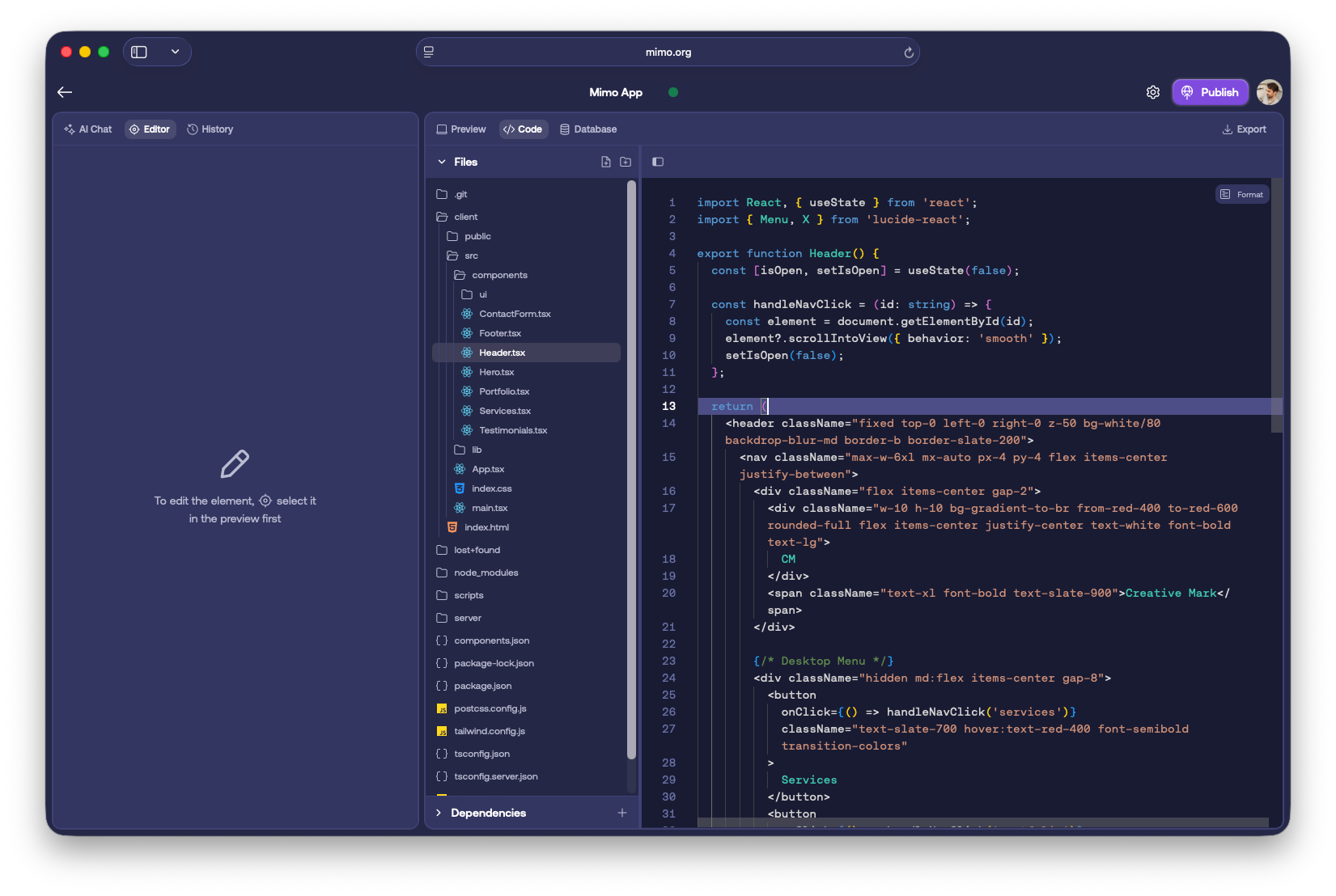 If you want to examine the code, you can access the Code tab in the web version of Mimo to inspect your app's code. All code that Mimo builds for your app is readily accessible.