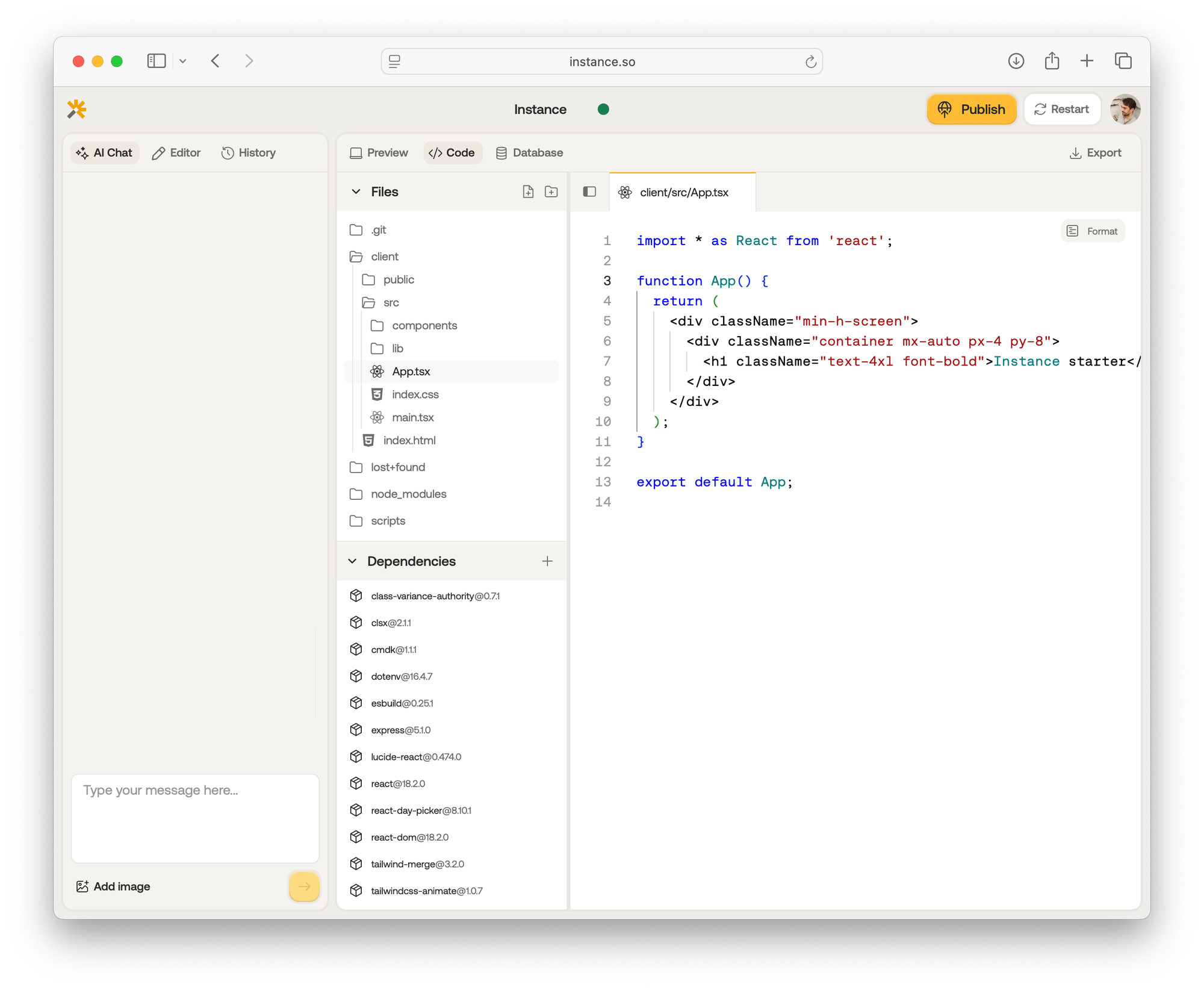If you want to examine the code, you can access the Code tab in the web version of Instance to inspect your app's code. All code that Instance builds for your app is readily accessible.