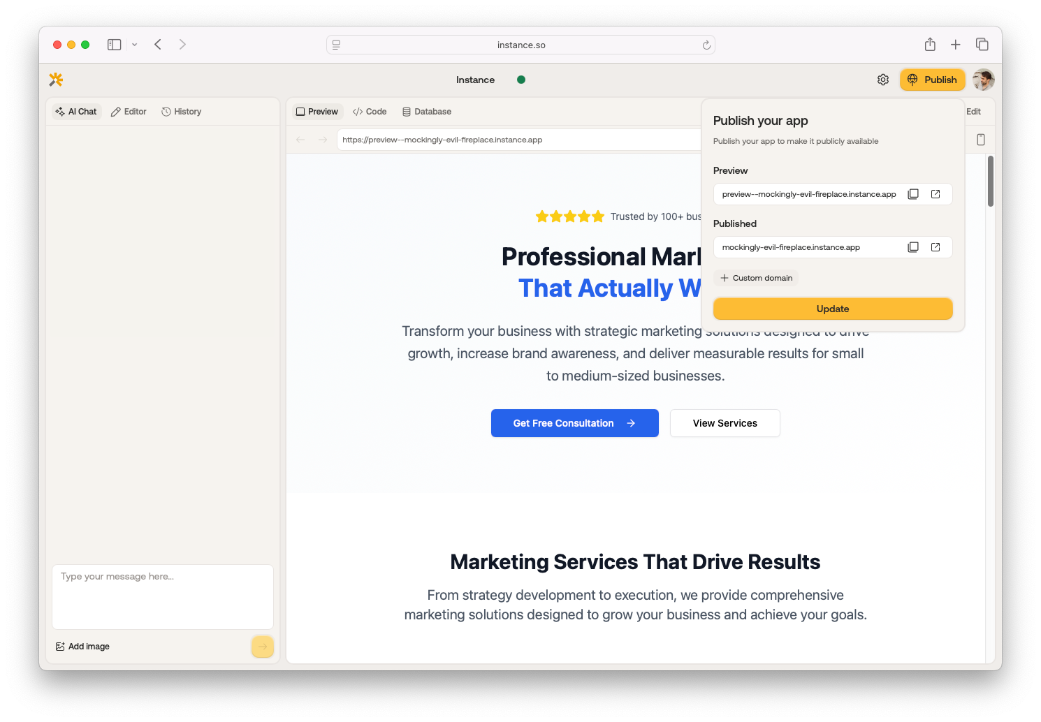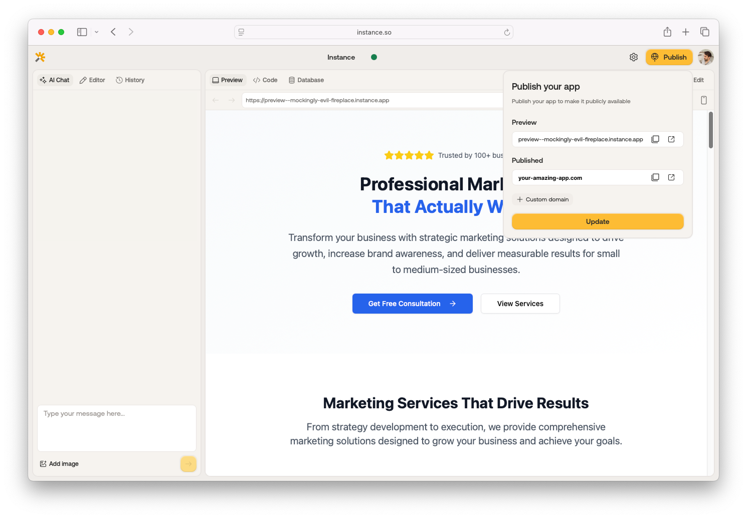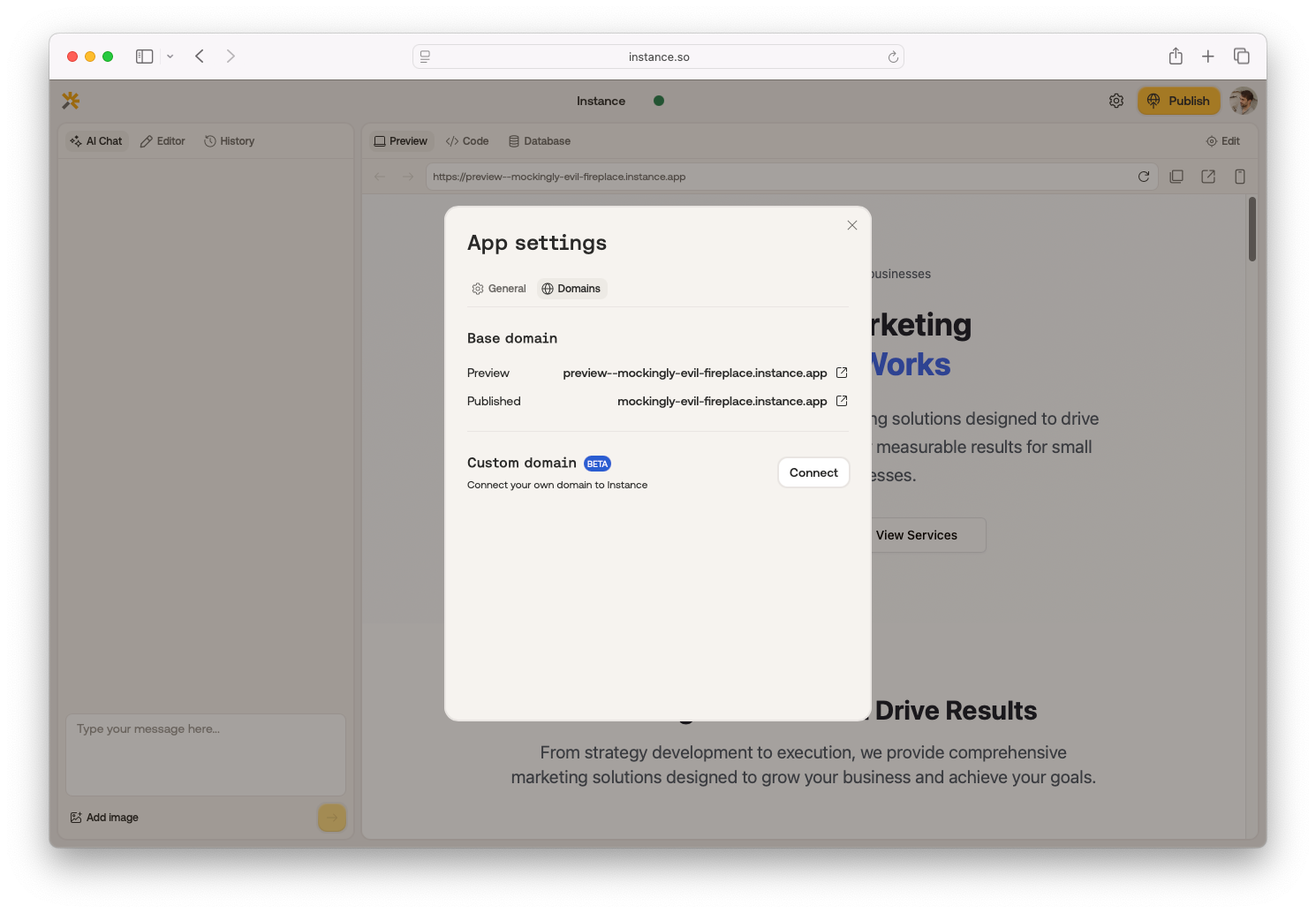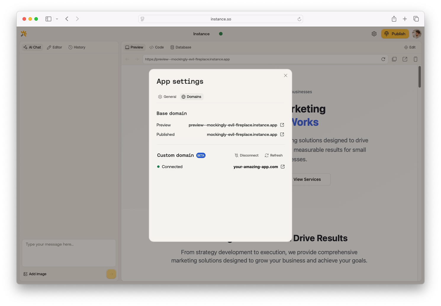 With Instance, you can publish your app with the click of a button. If you publish your app, your app will be available via the automatically assigned Instance subdomain, such as your-amazing-app.instance.app.