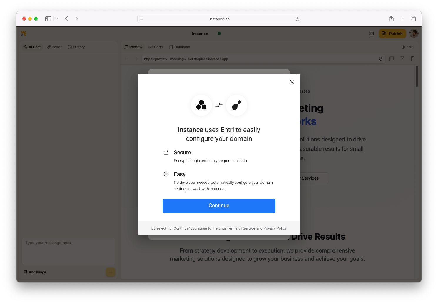 Instance will prompt you to authorize with Entri, a tool for domain setup. Simply follow the instructions to log in to your provider and grant Entri permission to update your domain settings.