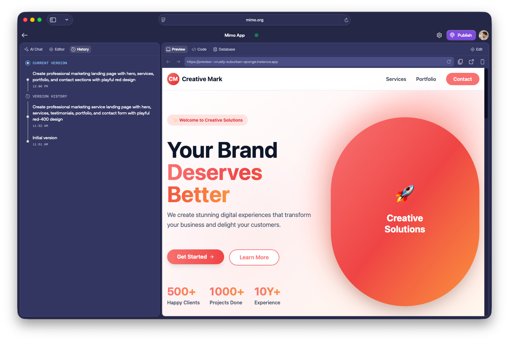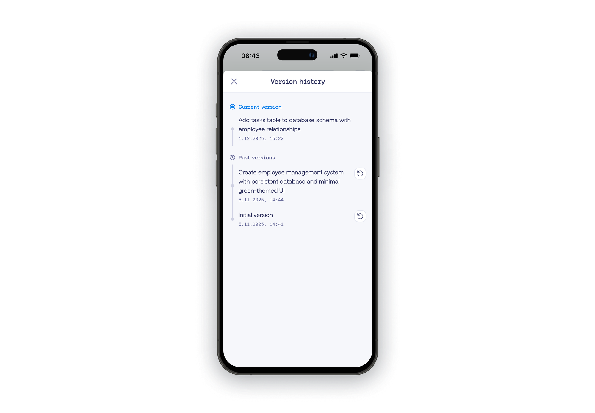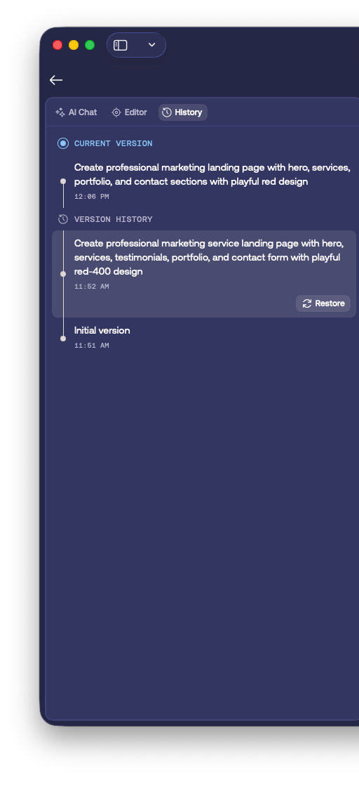 Every version of your app is persistently stored and accessible through the History tab. This gives you freedom to experiment, knowing you can always revert to a stable version whenever needed.