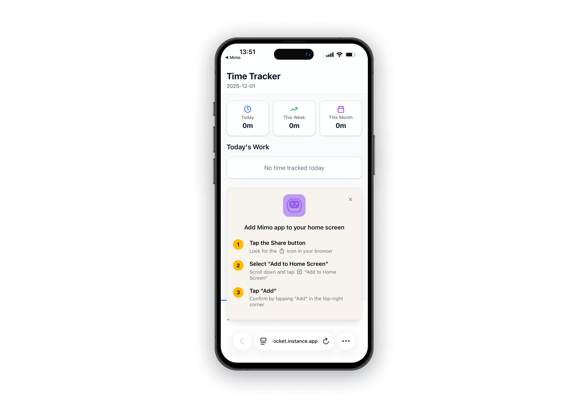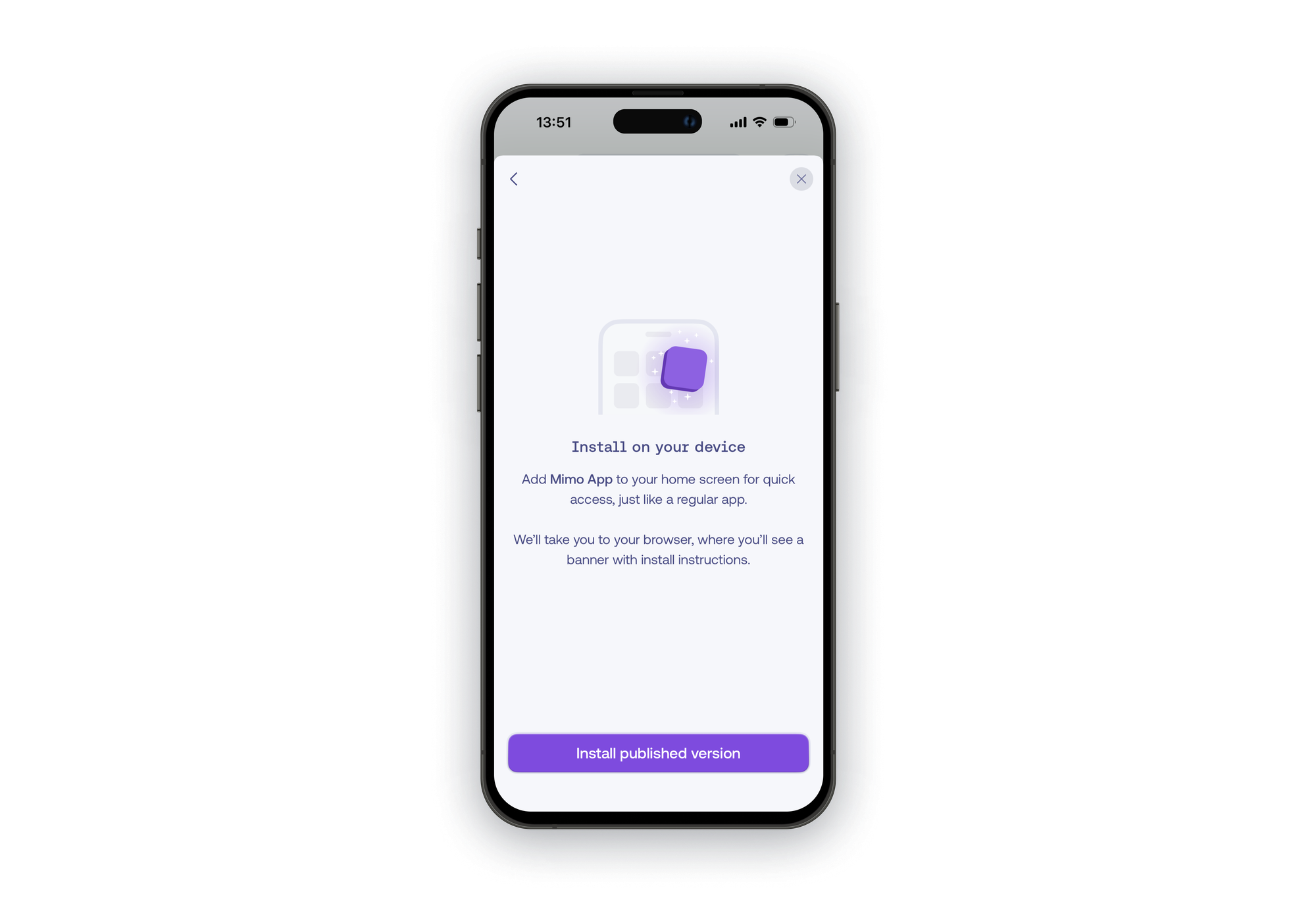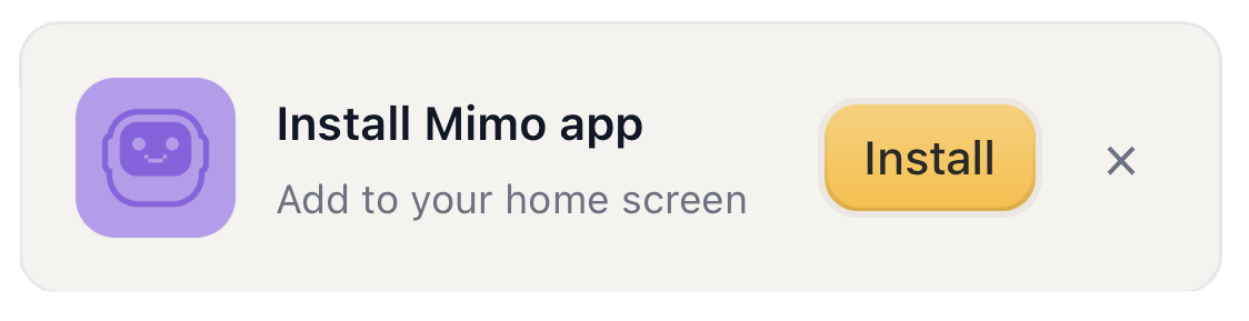 Mimo apps are automatically installable on mobile devices as progressive web apps (PWAs). Once installed, they appear on the home screen and work like native apps without extra configuration. PWA technology is built in and enabled by default.