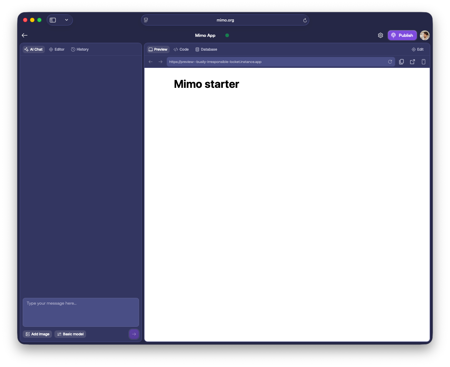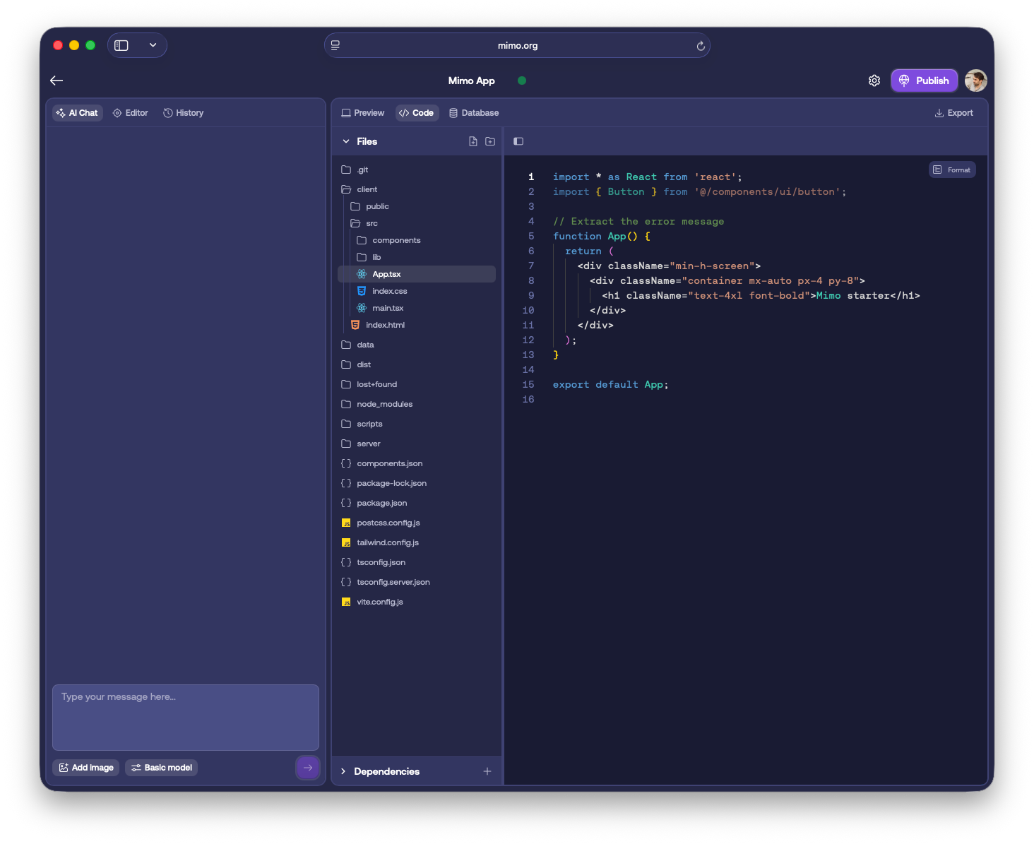 When you start working with Mimo, you don't begin with a blank slate. Each new app comes with our starter template, helping you get up and running quickly while enhancing the quality of AI-generated output.